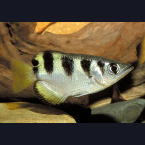 The archer fish is a species that spits a straight beam of water out of the surface. It has concentric bars and stripes across the body.