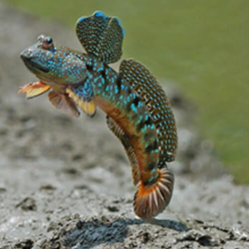 The Mudskipper is a fish that spends most of its time out of water and digs a tight network of burrows in silt mud.